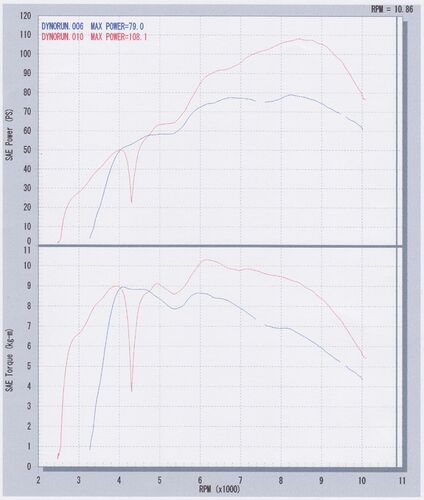 エンジン不調?の原因を探るには、まずは現状把握から。 というワケで、RSCでシャーシダイナモに載せてきました。 早速結果ですが。 108PS/8500rpmでした。 青色はスロットル開度50%でのデータで参考値です。 また、4300rpmくらいの谷は、急激にスロットルを…
